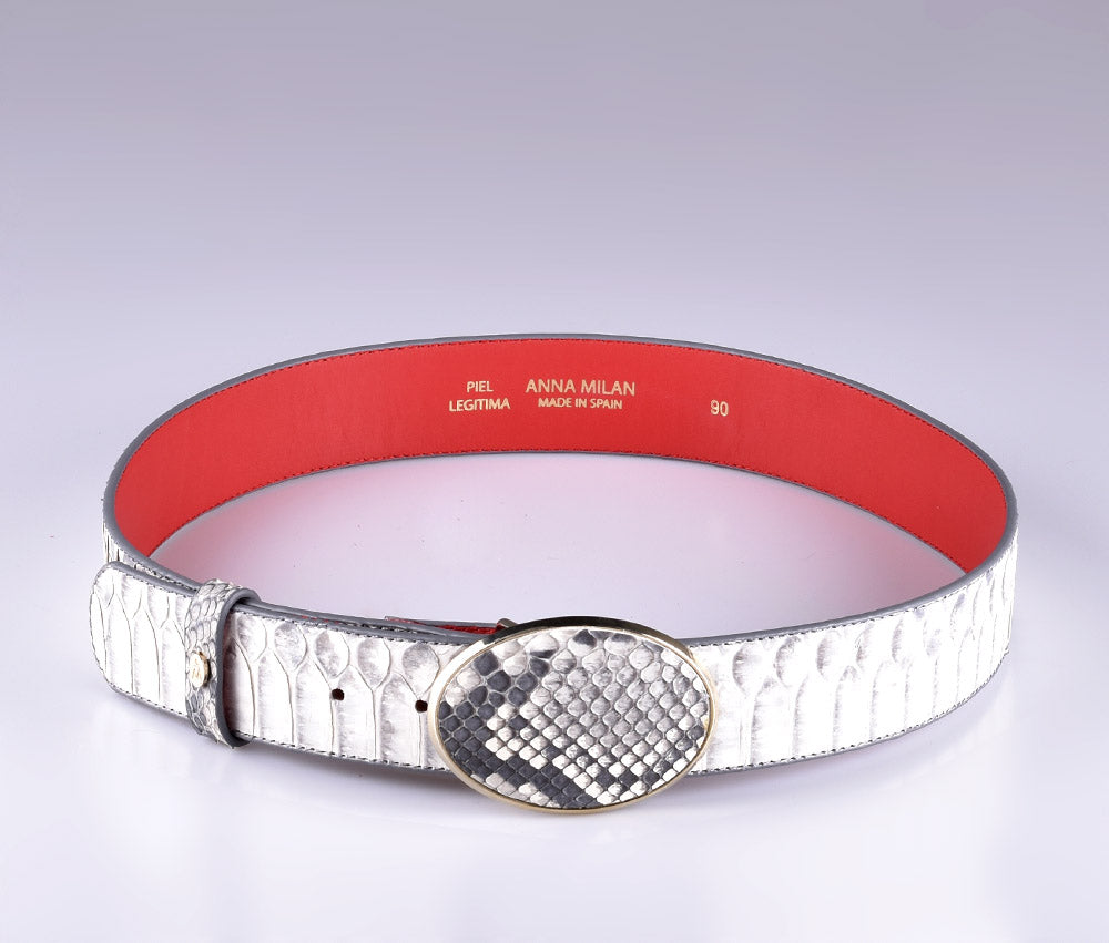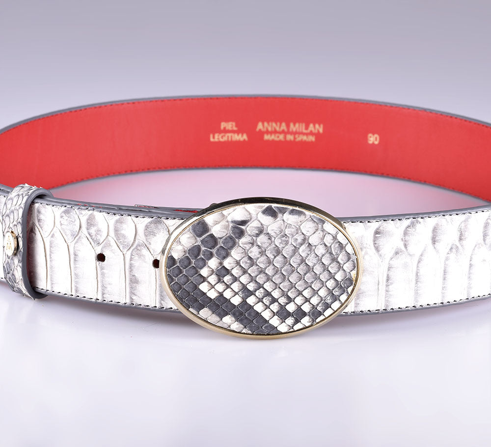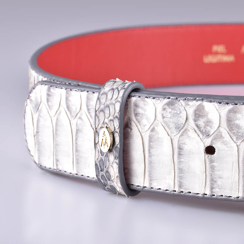 La face extérieure de la ceinture est entièrement réalisée en peau de python naturel, ce qui garantit que la matière est d'excellente qualité et que la ceinture reste en parfait état pendant très longtemps. La face intérieure a aussi ses détails : elle est en cuir de vachette rouge, ce qui la rend souple et résistante à la fois. De plus, Anna Milán a mis son sceau personnel et les légendes "Made in Spain" et "Legitimate Leather" en lettres dorées. Il a une boucle ovale doublée de la même peau de python blanc.