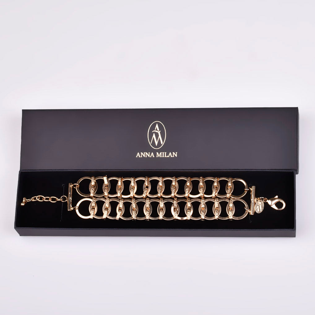 La ligne de bracelets en plaqué or pour femme d'Anna Milan nous surprend avec des bijoux comme ceux-ci qui transmettent bon goût et délicatesse. Fabriqué à la main et de nationalité espagnole, ce bracelet est un pur glamour et apporte de la distinction à vos mains.