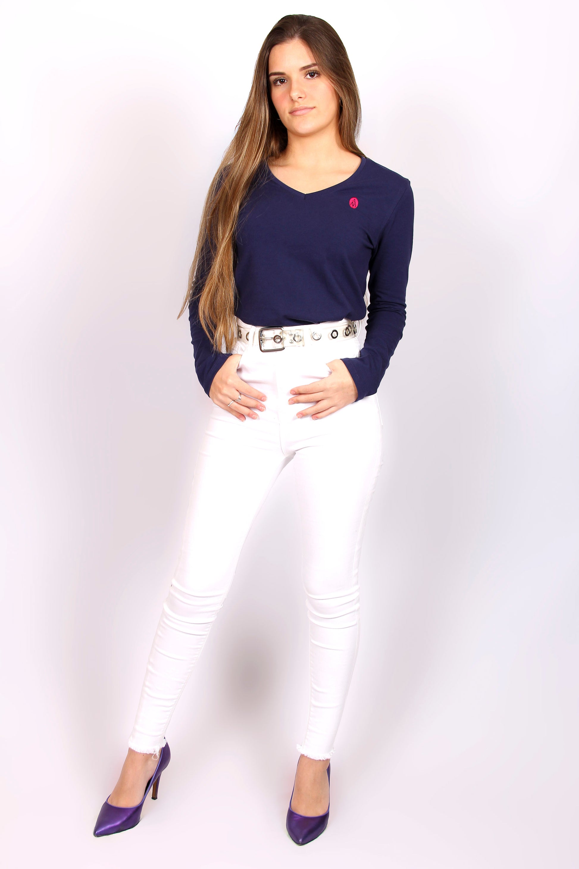 Il a le logo Anna Milan brodé dans une couleur fuchsia qui traverse élégamment le bleu monochrome. La marque nous donne toujours un détail qui rend la simplicité d'un t-shirt aussi glamour.