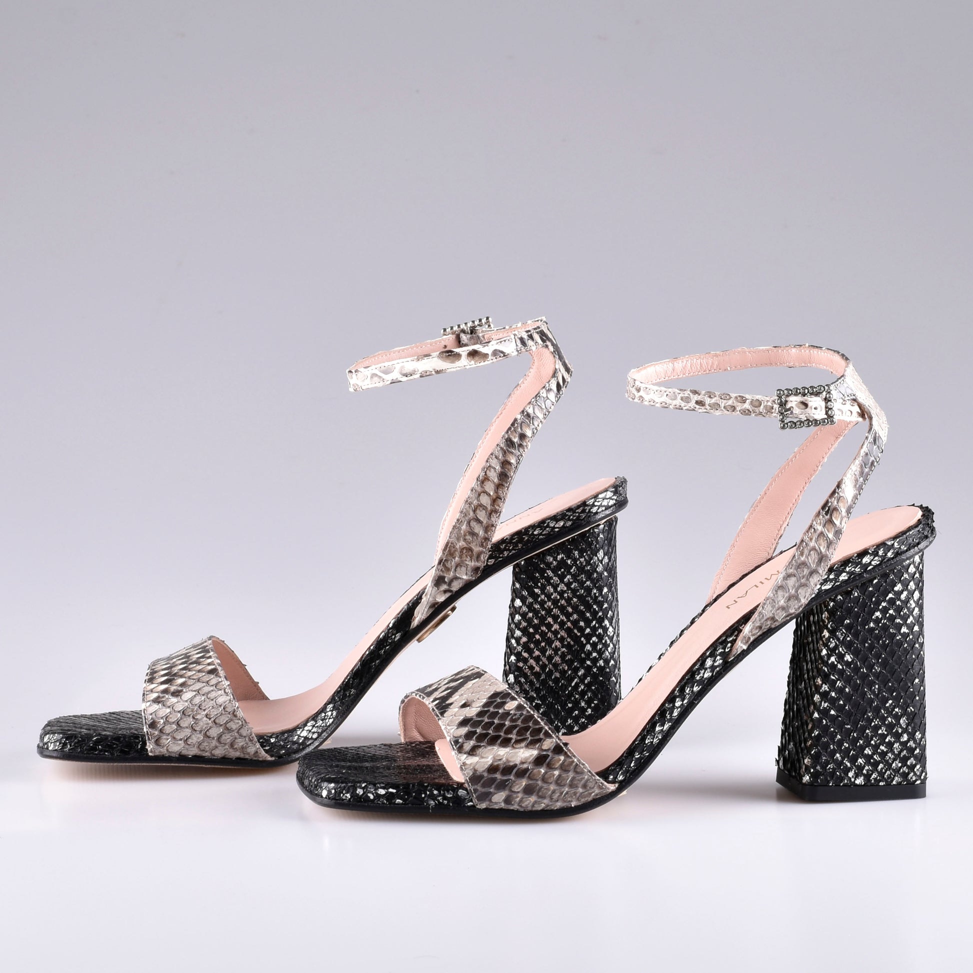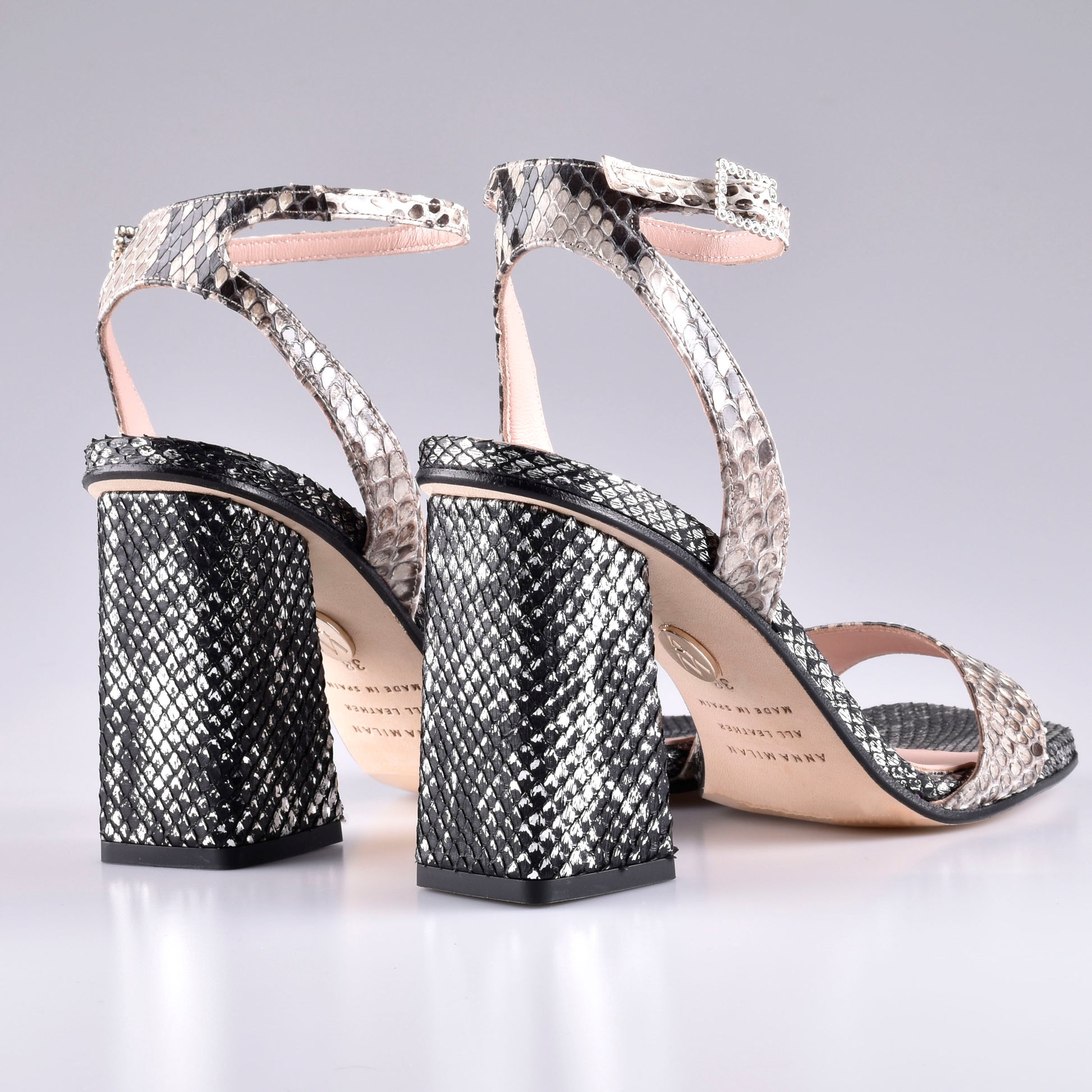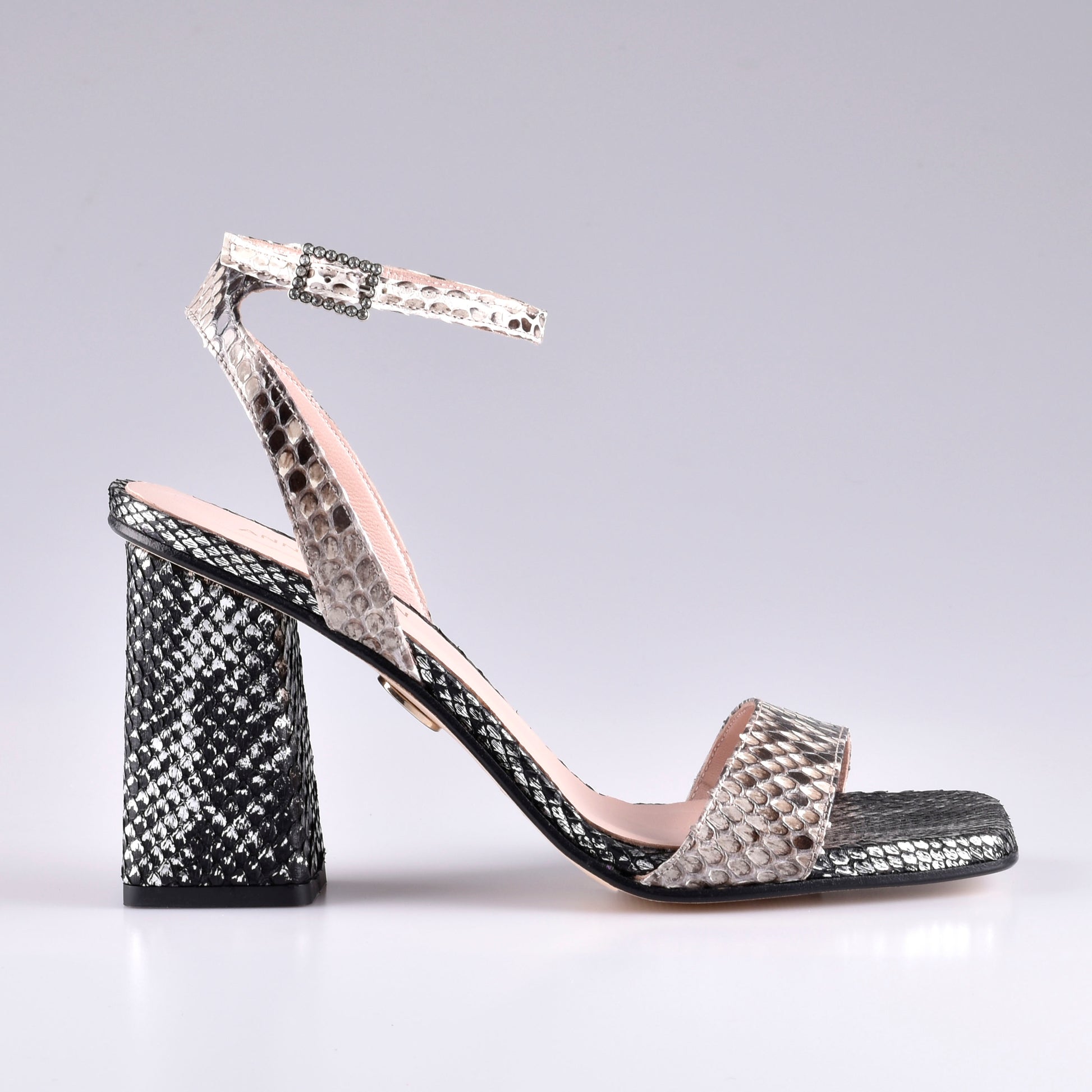 Com um design exclusivo e elegante, essas sandálias de couro natural prata e python cinza já são tendência e são perfeitas para a mulher de hoje que se veste bem dia e noite. É uma peça única uma vez que as escamas da pele de píton são todas de formas e cores diferentes, pelo que o padrão não se repete em nenhum outro modelo. O salto também é revestido em pele de píton e tem 9 cm de altura, a sola é em couro, enquanto o interior é em couro bege. Confeccionadas artesanalmente na Espanha, possuem palmilhas de gel que proporcionam conforto ao caminhar. Não perca o detalhe da fivela coberta de glitter.